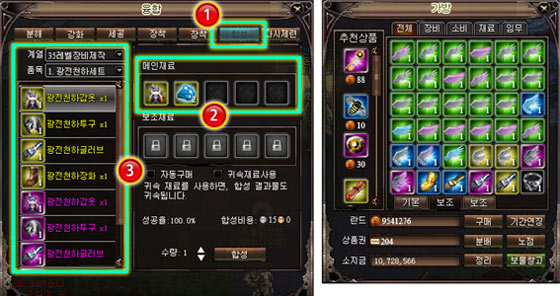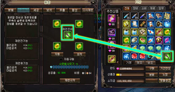 강화재료를 사용하면 아이템을 제련하여 장비가 가진 성능을 높일 수 있다.