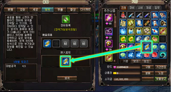 장비에 슬롯을 제작하여 보석을 장착하면, 보석이 가진 능력을 장비에 부여할 수 있다.