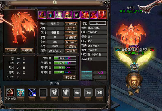 캐릭터가 소유한 펫은 주인의 스테이터스를 비롯한 기초 능력치를 상승시켜주며 전투에 참여한다.