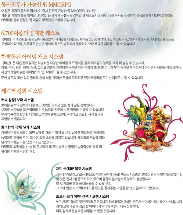 ์ ๋ชจํ๊ณผ ์ ์์ ๋ฐํ์ผ๋ก ํ ๋ฌดํ ํํ์ง MMORPG์ด๋ค. ์น์์์ ํผ์ณ์ง๋ ์ค์๊ฐ ๋์ ์ ํฌ์ ์ฝ๊ณ ํธ๋ฆฌํ ์กฐ์๋ฒ, ํ๊ฒ, ๋ ๊ฐ, ๋ณดํจ ๋ฑ์ ์ ํฌ ๋ณด์กฐ์์คํ