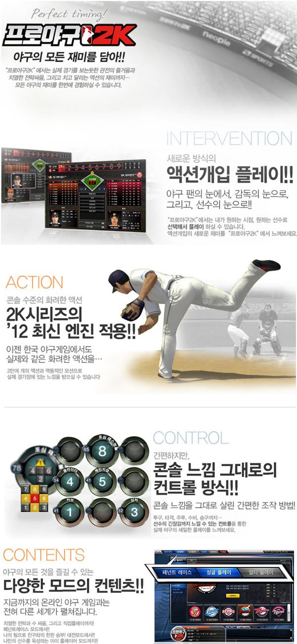 ‘프로야구2K’는 2011년 5월부터 넥슨이 2K 스포츠와 손잡고 공동 개발한 온라인 매니지먼트 야구 게임으로, 최고의 퀄리티를 자랑하는 콘솔 야구게임 ‘2K 시리즈’의 2012년도 최신 엔진을 바탕으로 KBO 공식 기록 데이터와 선수의 그래픽을 게임에 반영, 기존에 경험할 수 없었던 새롭고 혁신적인 야구 게임으로 재탄생 됐다. 현재 출시된 실사형 야구 게임들이 ‘액션’ 중심이라면, ‘프로야구2K’는 자신만의 구단을 만들고 육성하는 ‘시뮬레이션’을 기반으로 실시간 작전 전술 및 투타 개입이 가능한 ‘액션 개입 시스템’을 도입, 경기 관전 중 결정적인 순간에는 직접 투수 혹은 타자로 개입해 직접적인 액션을 통해 승부를 결정지을 수 있도록 했다.