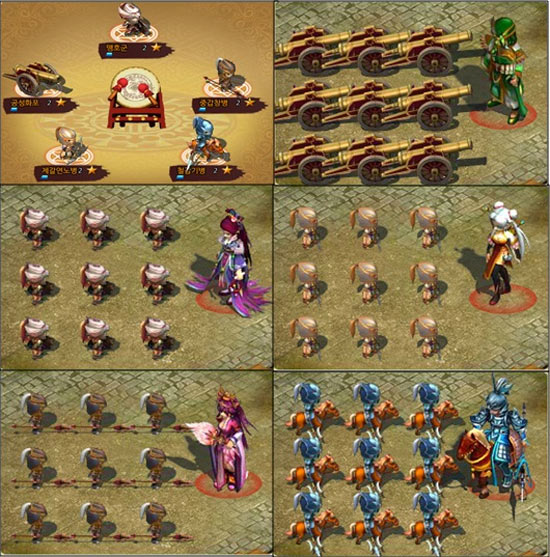 게임은 도병, 창병, 기병 궁병 등 4종류의 병사간 상성 관계에 의해 진행되고 보유한 병력에 따라 부대의 무장 능력도 달라진다.