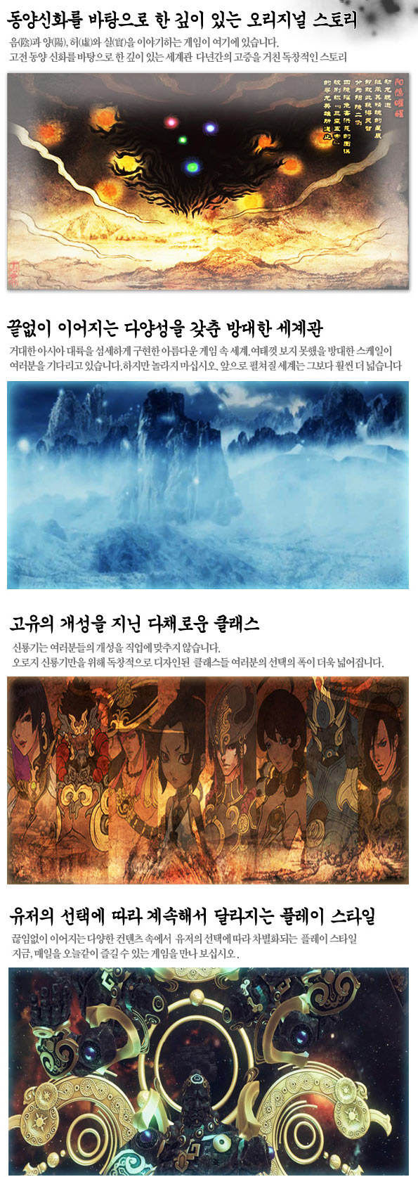 신룡기는 정통 오리엔탈 MMORPG로 깊이 있는 동양철학을 바탕으로 한 세계관이 인상적인 게임.