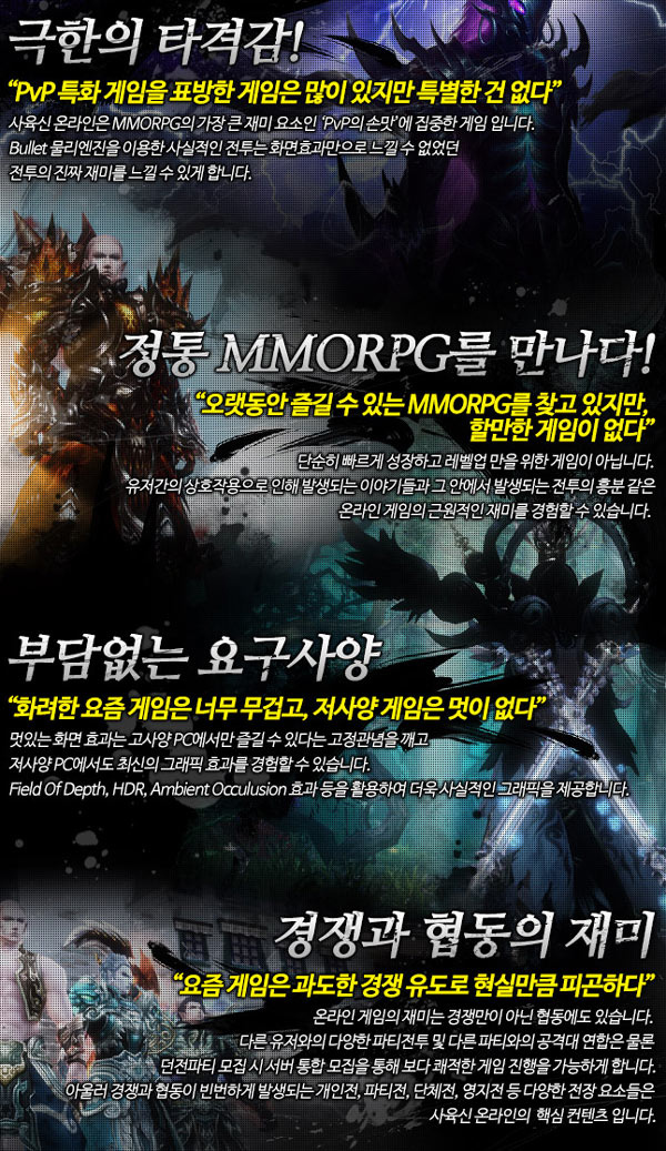 ‘사육신 온라인’은 자체 개발 엔진을 사용한 풀 3D MMORPG 장르의 클라이언트 온라인 게임으로 정통 무협 무림세계인 과거 전설의 무공을 가진 4대 영웅들의 이야기를 기반으로 한다. 다양한 강화시스템과 제작,채집, 결혼, 문파 하우징 등의 생활시스템 그리고 필드 PK, 개인전, 단체전, 영지전, 문파전 등 특화된 무공대결 PVP 시스템까지 갖추고 있어 전투 자체의 재미에 포커싱을 둔 것이 특징이다.