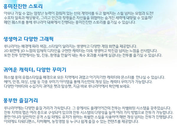 ‘루나리아’는 중국, 북미, 대만, 프랑스 등 여러 국가에서 성황리에 서비스 되고 있으며, 간단한 조작으로 어드벤처의 요소를 만끽할 수 있는 2D 횡스크롤 액션 RPG 웹게임 이다. ‘루나리아’의 아름다운 배경과, 생동감 넘치는 전투 효과는 판타지세상에서 펼쳐지는 탄탄한 시나리오의 재미를 배가시켜준다.