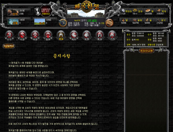 ‘제국전쟁’은 중국, 비잔티움, 이집트, 바이킹, 훈족, 잉카, 터키 등 기원전 1,000년경에 실존했던 10대 문명 중 하나를 선택해 진행하는 전략 웹게임으로, 유저는 한 제국의 군주가 돼 자신이 선택한 문명의 특징에 따라 국가를 관리, 발전시킬 수 있다.