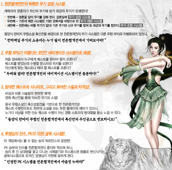 ‘천존협객전’은 정의의 집단인 정파에 속하는 아미파, 불문파, 신가파, 청성파, 백화파 등 총 5가지 문파가 등장하며 각각의 캐릭터는 각기 다른 전투 방식과 특징을 보여주게 된다. 특히 캐릭터의 성장에 따라 무기에 영혼치를 부여하는 무기 성장 시스템은 ‘천존협객전’의 가장 주요한 시스템적 특징이라 할 수 있으며, 게임의 재미를 한층 높여 줄 것으로 기대된다.