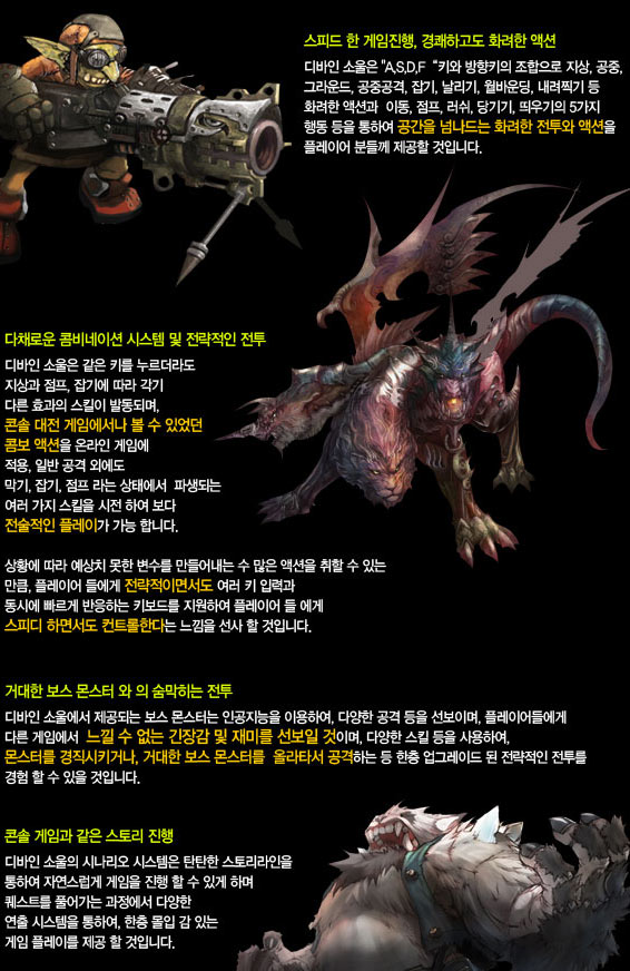 디바인소울은 화려한 액션과 시원한 타격감을 필두로한 콤보 액션 RPG 이다. 기존의 횡스크롤 방식의 액션게임과는 차별화되는 Full 3D 방식의 (쿼터뷰, 프리뷰,백뷰지원) 구현으로 액션게임에서 느낄수 있는 모든 요소를 지닌 게임이다.
