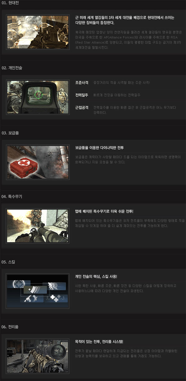 또한 ‘언리얼 엔진’을 기반으로 제작되어 엔진 자체의 커스터마이징을 통한 높은 수준의 그래픽 퀄리티와 최적화 된 안정성을 갖추고 있으며 ‘밀리터리 FPS’만의 빠른 전개와 동시에 ‘폭격’과 ‘전리품’ 등 전략을 요하는 콘텐츠를 추가하여 실제 ‘현대전’을 연상시키는 게임성 구현을 장점으로 하고 있다.