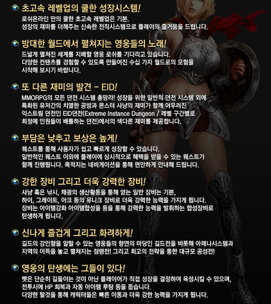 ‘로쉬온라인’은 갤럭시게이트㈜의 개발노하우와 수년간의 집념어린 노력의 결실을 보여주는 작품으로 정통 MMORPG의 진수인 대규모 공성전과 PVP, PVE, EID 등의 전투시스템을 기반으로 하고 있다. 전투부분에 있어서도 성장을 위한 사냥과 경쟁을 위한 전투가 다양하게 제공되는데 특히 PVE 전투인 EID 던전의 경우 유저간에 경쟁을 할 수 있는 시스템을 제공함으로서 자칫 지루하다고 느낄 수 있는 사냥에 경쟁요소를 가미하여 강화된 커뮤니티 속에서 경쟁의 재미를 찾을 수 있게 한다.