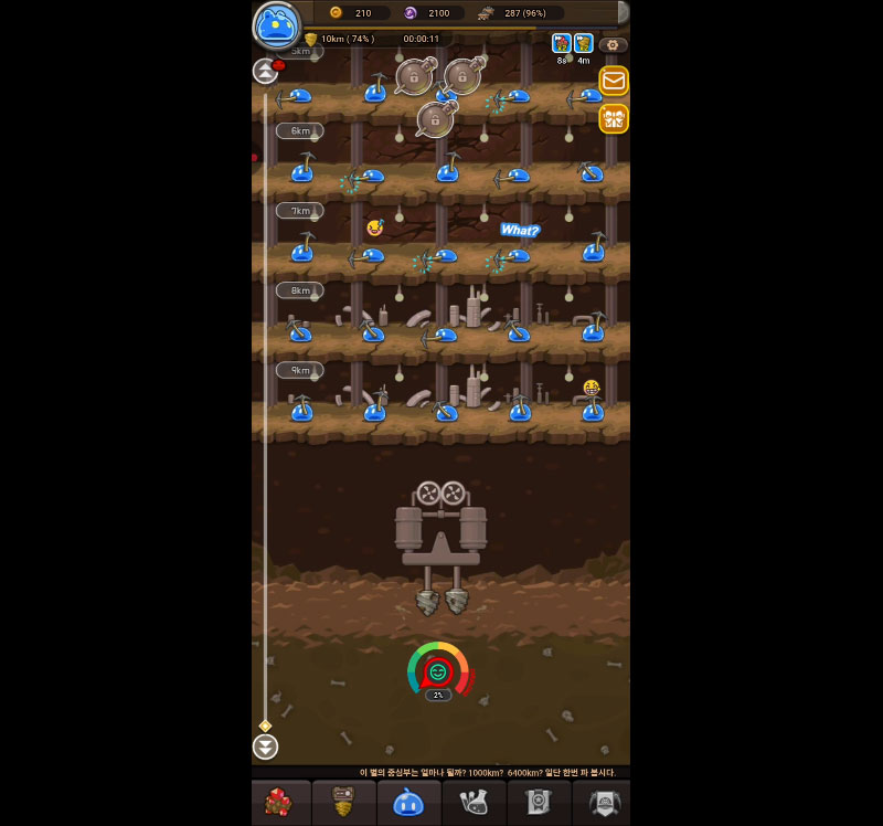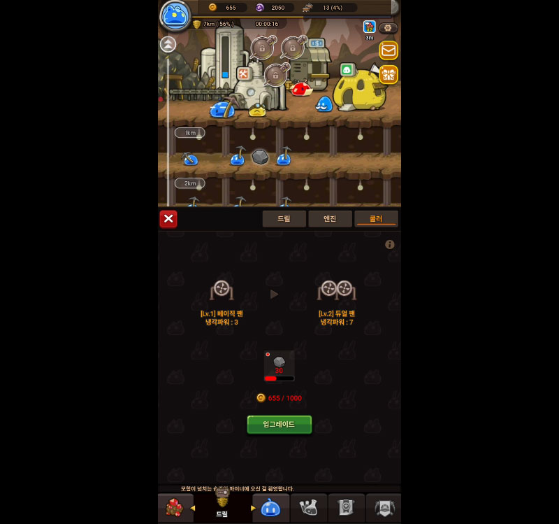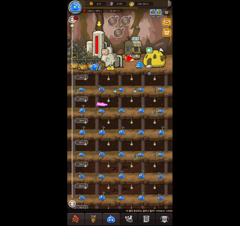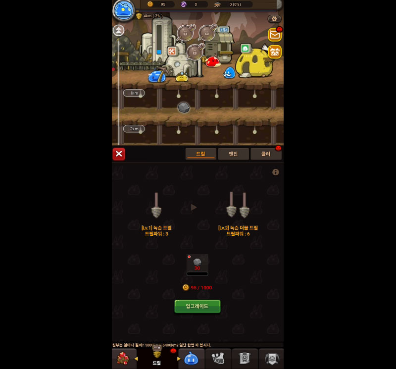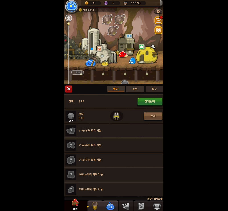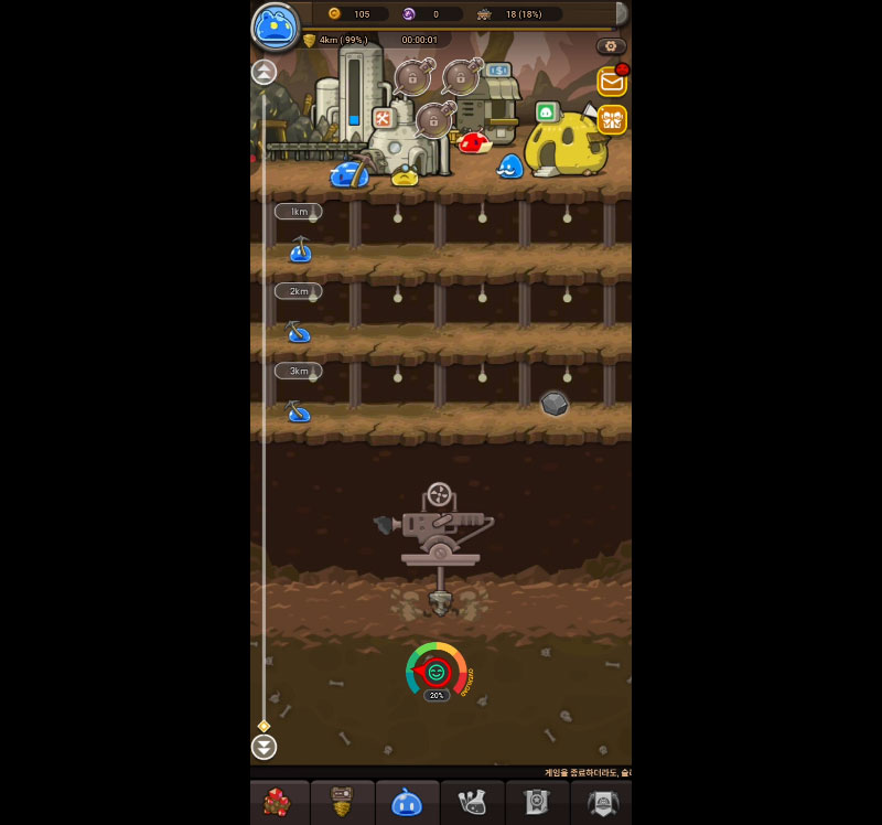 자원을 투자해 광부 슬라임, 장비, 기지를 성장시키는 재미