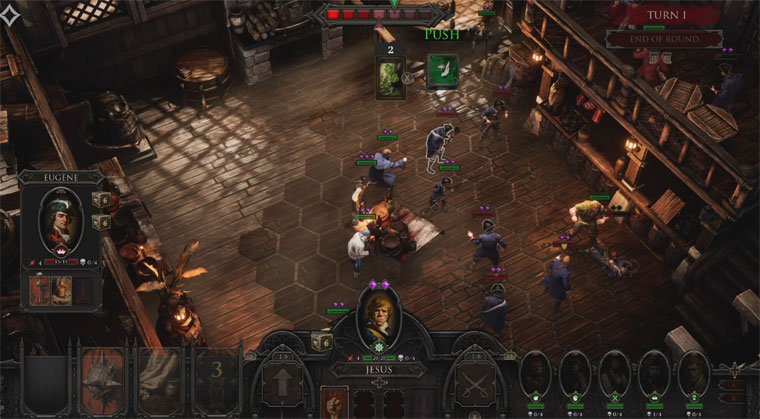 전술 단계에서 카드를 사용하여 스킬과 특성을 발동하고, 주사위 싸움에서 우위를 점하세요.