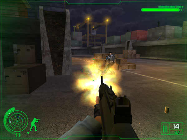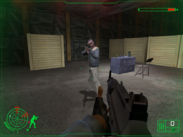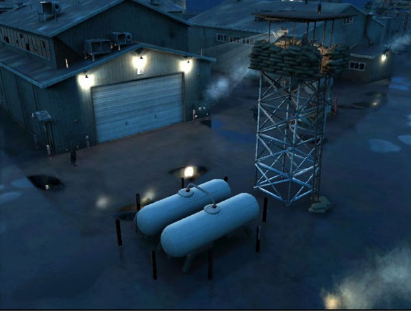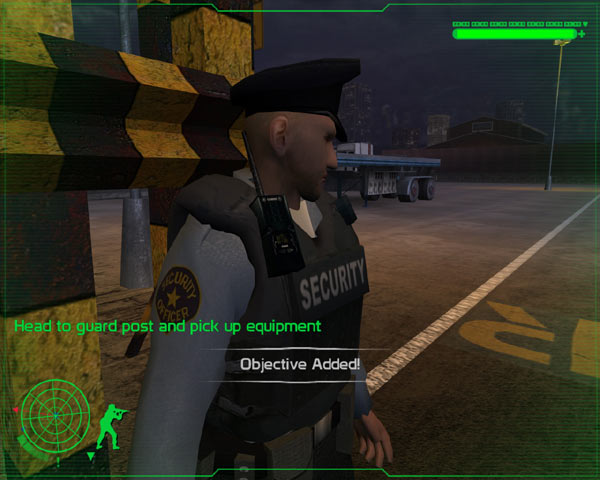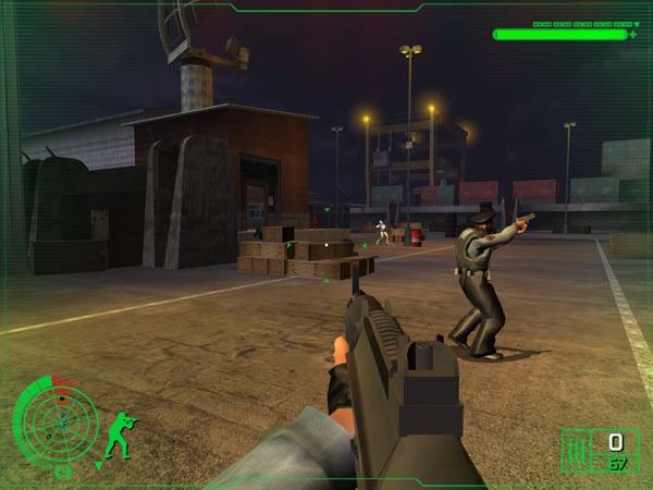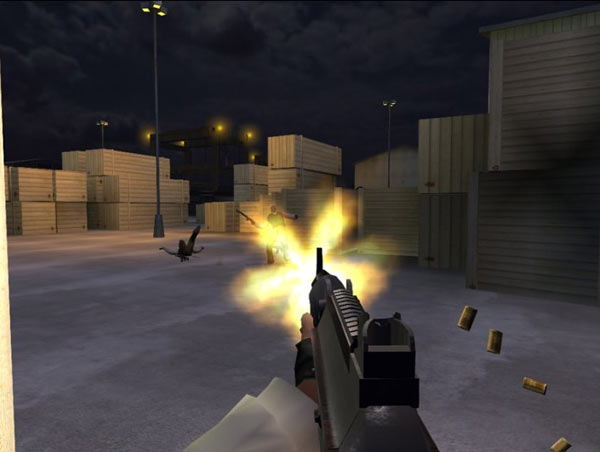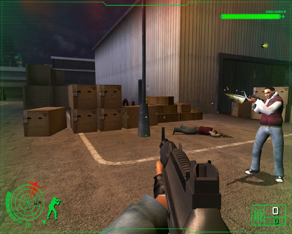 몇몇의 동료 경비원이 플레이 캐릭터의 움직임에 따르면서 엄호해 준다. 적의 수가 꽤 많기 때문에 동료를 잘 리드해 싸워야 한다. 적들 중에는 먼 거리의 컨테이너 위에서 이쪽을 조준사격해 오는 녀석도 있으므로 조심해서 이동해야 한다. 이런 적들은 마우스 오른쪽 클릭으로 정밀 조준모드로 사살하면 편하다. 또한, 창고가운데에는 체력을 회복해 주는 구급 상자나 방탄복이 놓여져 있으므로, 획득해서 사용하면 된다.