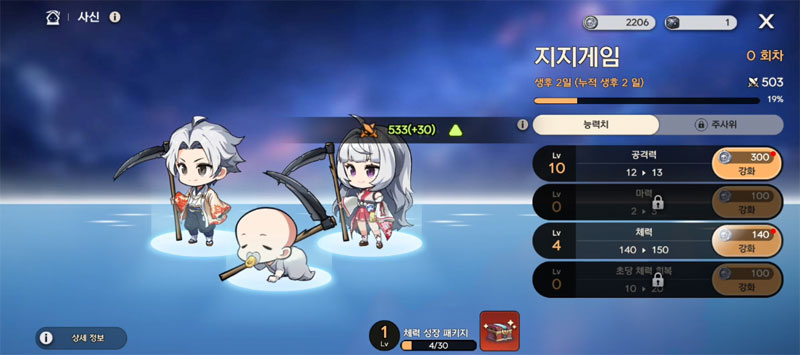 레벨업에 따라 꼬마 사신이 점점 어른 사신으로 변화합니다.