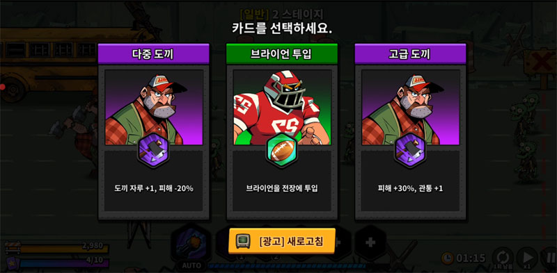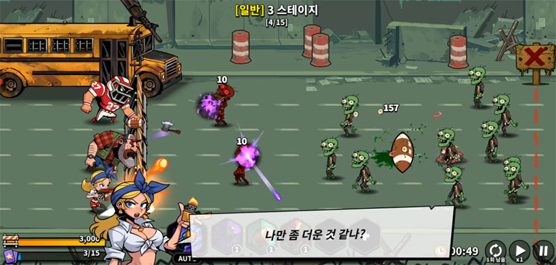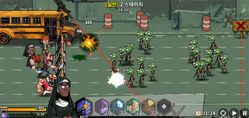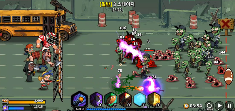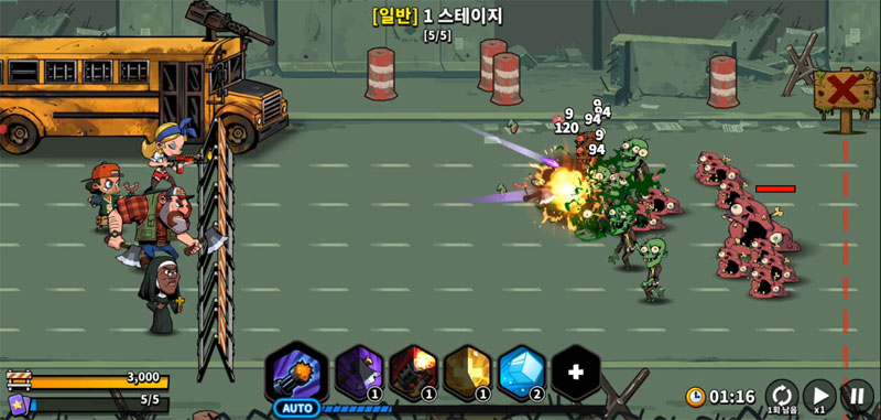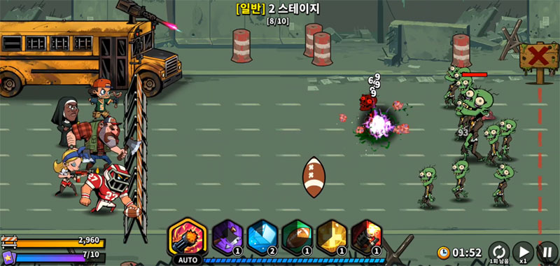 몰려오는 좀비를 차량과 캐릭터 조합으로 방어