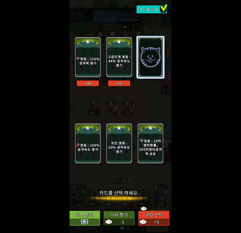위급한 순간, 단 한 번의 찬스! 웨이브 중 강력한 스킬 카드로 전황을 뒤집어라.