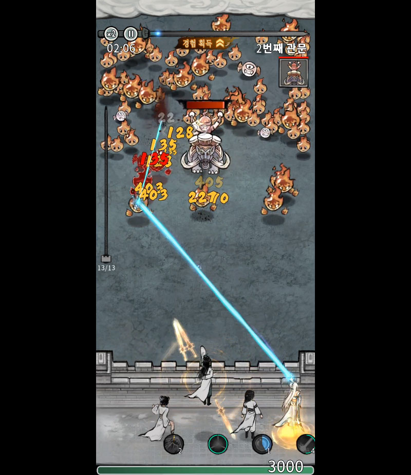 전투는 타워 디펜스 방식으로 진행되며, 성을 방어하는 동시에 제자들의 스킬을 적절히 활용해 몰려오는 적을 막아내야 합니다.