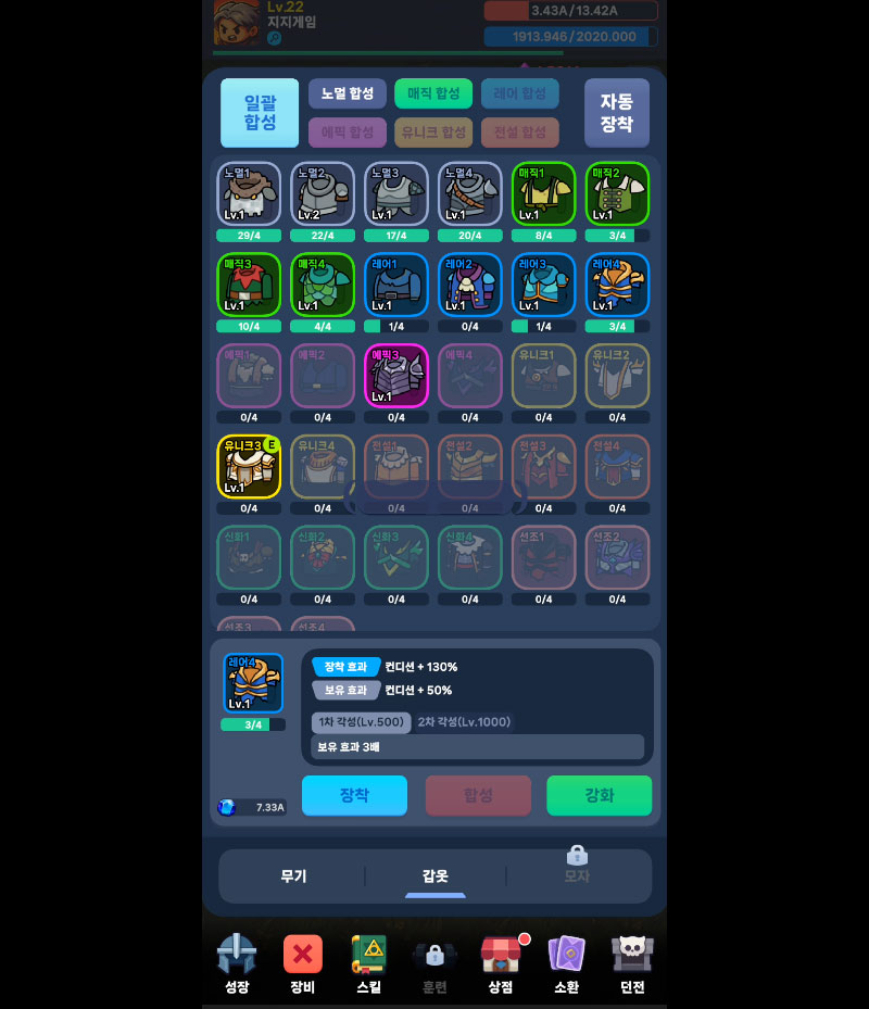 - 장비 합성을 통해 최하급부터 신화급까지 성장하는 수집 요소